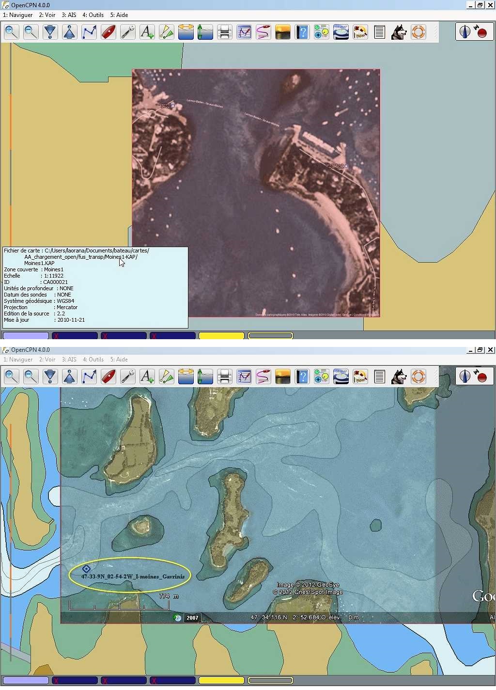 - Superposer une image Google Earth et une carte marine avec OpenCPN : pour la navigation, on peut souhaiter superposer une image satellite et une carte marine lorsqu’une zone très proche d’une côte est cartographiée de manière trop sommaire. L’image Google fournit souvent des détails comme la nature des fonds par exemple.