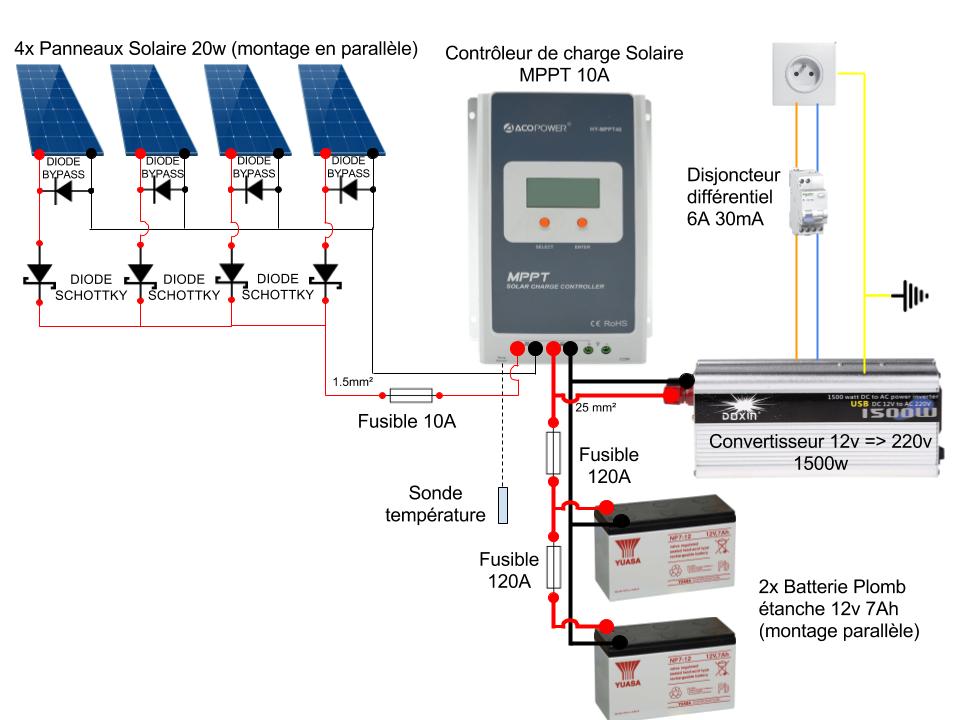 - Le câblage doit respecter la symétrie et c’est très important pour que leur charge et décharge soit homogène d’une batterie à l’autre.