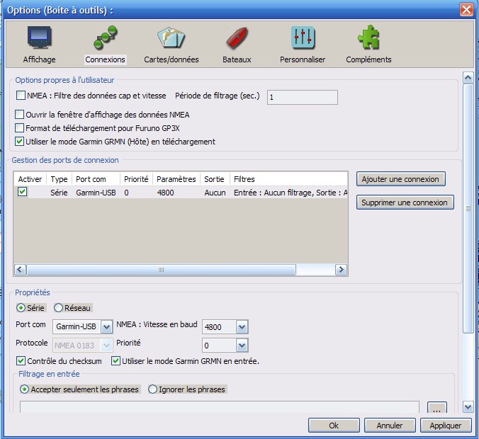 Doit-on cocher dans « connexion » la case « Utiliser le mode Garmin GRMN ( hote ) puis dans les parametres de la connexion pour » Port Com « doit-on choisir » Garmin-USB « ( le GPS est branché avec un cable USB ) et enfin doit-on cocher » utiliser le mode Garmin GRMN en entrée " .