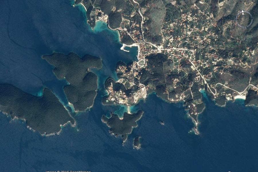 Ce mouillage, jadis attractif, sur le continent, juste à la sortie de la pointe sud du détroit de Corfou,est maintenant gravement dénaturé par un bétonnage agressif en particulier au sud et sur les îles, tombés sous la coupe de grands complexes hôteliers
