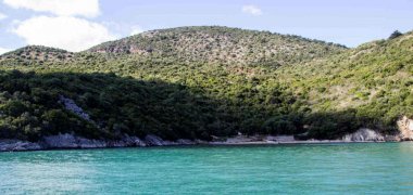 | Vu depuis la mer Ionienne crédit photo s/y Laorana | vu depuis Lysigée : la petite plage et sa taverne |