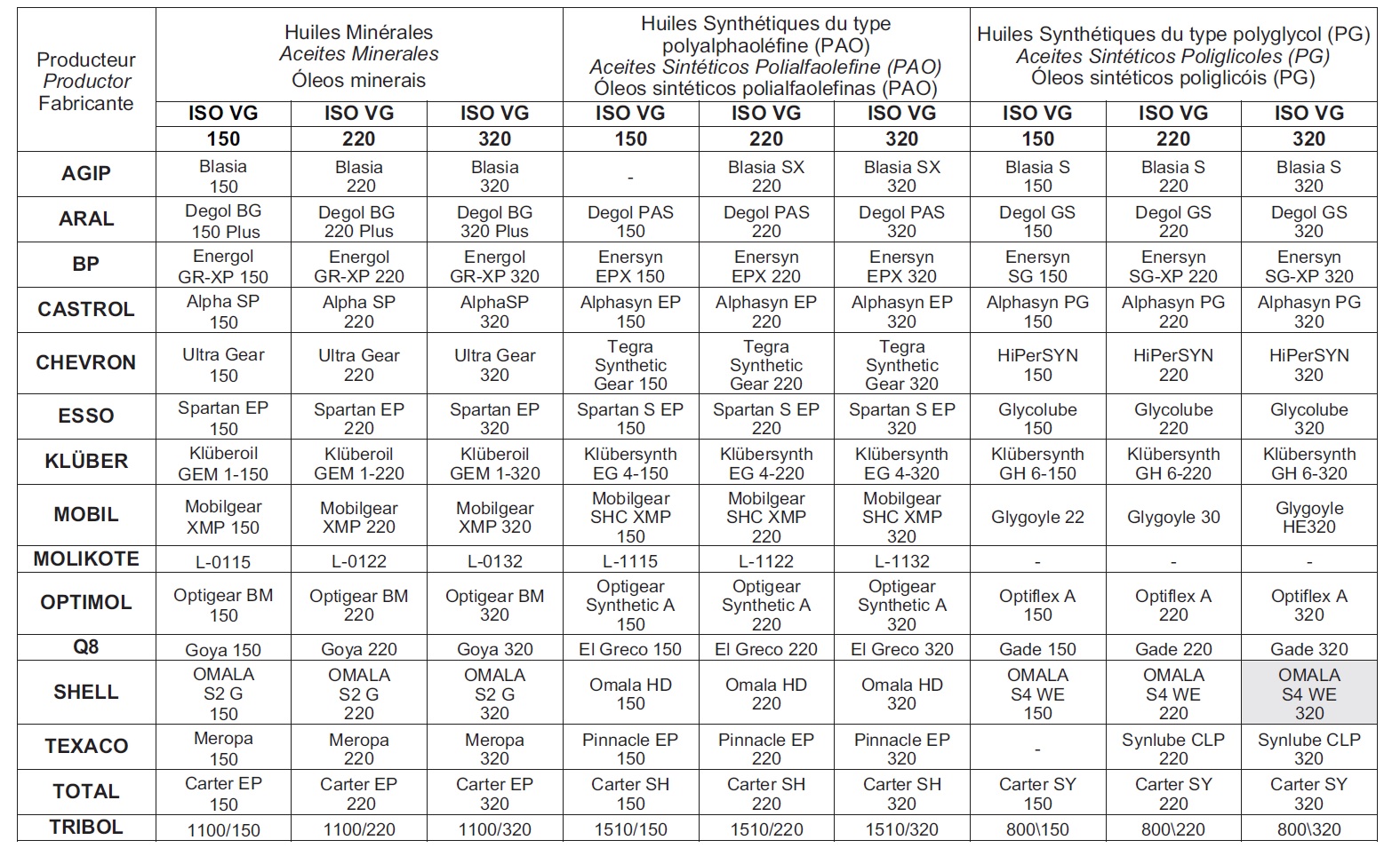 http://www.dllub.com/huile-pour-red...Nombreuses équivalences : exemple de tableau fourni par un fabricant de réducteurs joint...