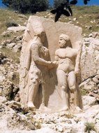 Il y avait sur une des terrasses sises sous le tumulus, parmi des stèles représentant les signes du zodiaque, une grande représentant Antiochos IV, the king du royaume « Comme la gêne ».... Il semblait me serrer la pince ! Je ne savais pas avoir eu de telles relations dans une vie antérieure et je ne sais toujours pas qui m’avait piqué mon caleçon !