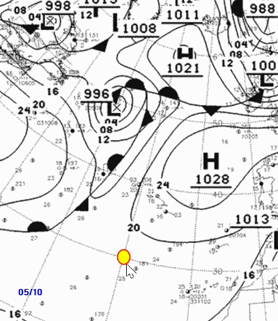 - Du 30.4 N -31.8 W le 5 octobre, à 500 milles au S/SW des Açores, la dépression parcourt 550 milles pour se retrouver au 30.3 N -39.9 W, le 8 octobre, à 700 milles dans les SW des Açores. Le lendemain, le 9, le NHC déclarera son potentiel cyclonique