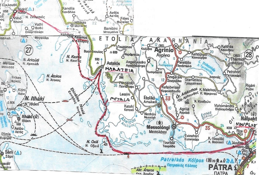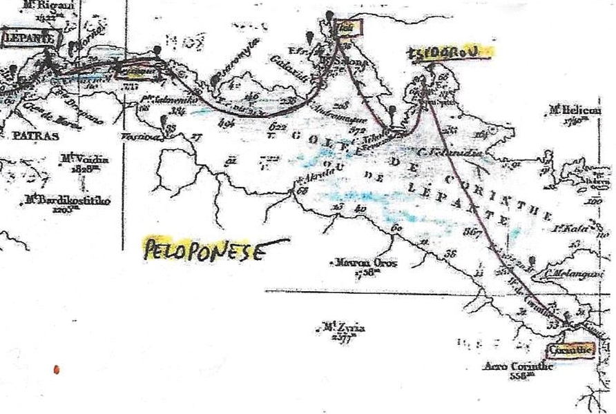 - Après un mouillage dans une anse abritée de l’île Trisonia, non loin du détroit de Rion fermant le golfe de Corinthe, on arriva au soleil couchant à Naupactos (Lépante), non sans avoir tiré des bords contre un vent d’Ouest... en plein de face,