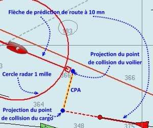 Cette ligne de pointillé jaune représente le CPA c’est à dire la représentation d’une droite situant la distance et le relèvement entre la cargo et le voilier quand ils seront au plus proche... S’il ne changent pas de route ou de vitesse