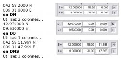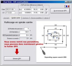 - Choix du circuit SS (spirale carrée) C’est le cas le plus compliqué car l’étendue de couverture de la zone est conditionnée ici par le paramètre (4) espacement du parcours ou largeur de la bande de ratissage. Heureusement une calculatrice est incorporée au logiciel et vous indique la zone couverte par vos choix. Commencer donc par rentrer le plus important qui est (4) espacement du parcours, et ensuite ajuster le paramètre (2) nombre de parcours, afin d’obtenir une couverture de zone satisfaisante.