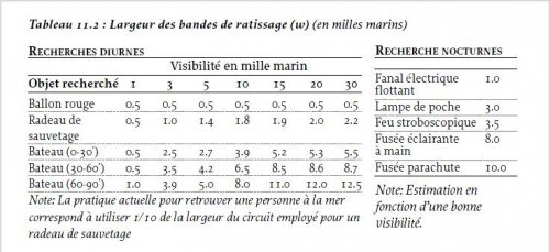 Là c’est un peu différent... Le CROSS interviendra pour vous préciser la couverture souhaitée de la zone de recherche et cela sera donc à vous (le navigateur) de définir les autres paramètres, en particulier la largeur de la bande de ratissage. La concertation avec le patron du canot qui connaît bien les limites de sa « machine » sera primordiale pour la précision du suivi de circuit. A ce propos regardons ce que dit le manuel :