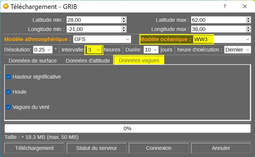 Quelle que soit la méthode, elle permettra l’ouverture d’une fenêtre d’affichage des options de téléchargement. Pour démarrer, nous vous conseillons de n’utiliser que le modèle GFS, avec cette méthode. Les autres modèles sont facilement téléchargeables en modules pré découpés, suivant une procédure automatisée, qui sera traitée au paragraphe suivant.