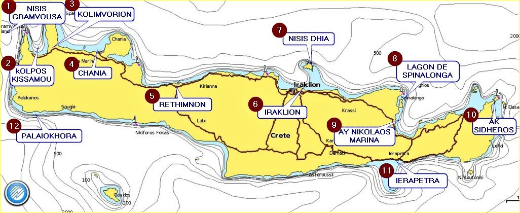 Si l’on trouve de nombreux petits ports sur la côte nord, seuls quatre d’entre eux offre des protections correctes par gros Meltem : Chania, Rethimnon, Heraklion et Aghios Nikolaos. Sur la côte sud, Ierapetra et Palaiokhora offre une bonne protection, une fois à l’intérieur, mais leurs accès sont difficiles, mal pavés, et on ne trouve pas de l’eau partout...