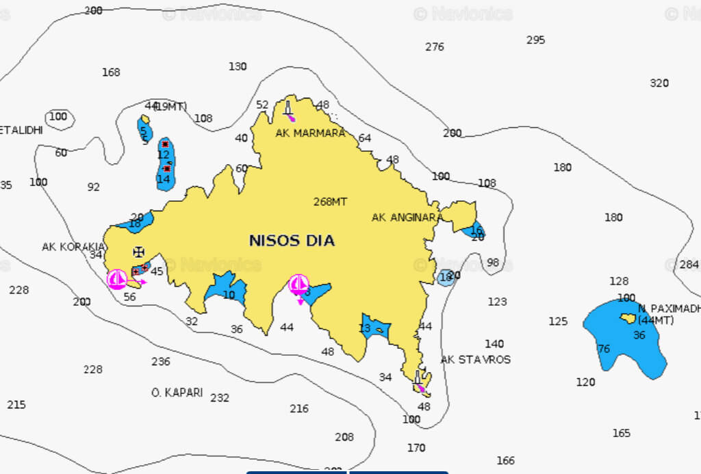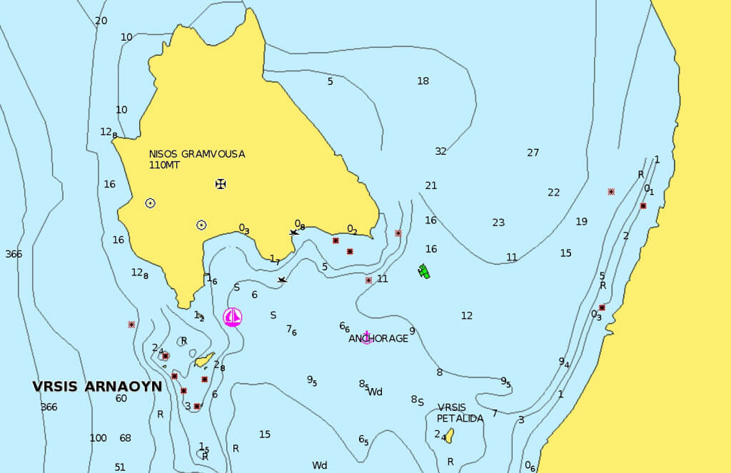 - A l’extrémité NW de la Crète, on trouve un bon mouillage forain, dans un cadre enchanteur. Attention aux haut fonds au SW de l’île.