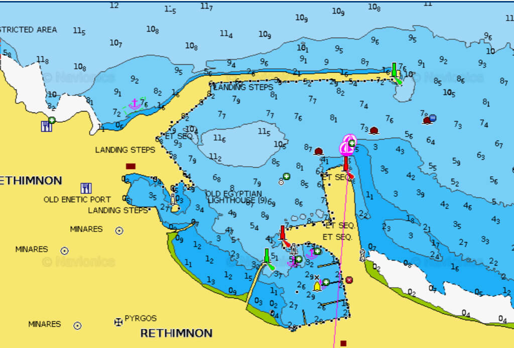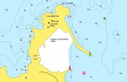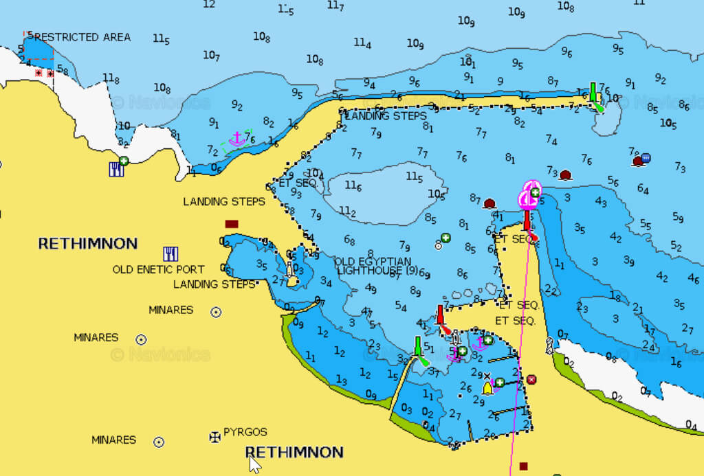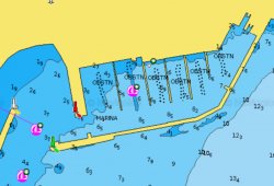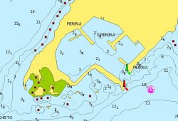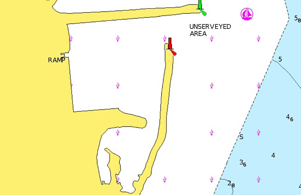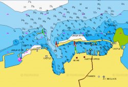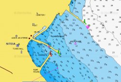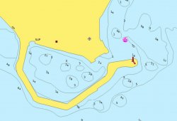 - La baie à l’ouest avec des môles neufs, semble être une zone de restriction à la navigation