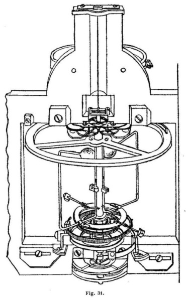Le prix de 1767 avait pour sujet « la meilleure manière de mesurer le temps en mer ». Louis XV « y avait applaudi et avait promis ses faveurs aux méthodes qui seraient proposées ». Le Roy, à cette occasion, remit à l’Académie sa montre n° 1, désignée plus tard par A (ancienne), le 5 août 1766. La deuxième, appelée n° 2 ou S (seconde), fut d’ailleurs identique. La description de l’instrument était donnée dans un mémoire déposé le 5 septembre, que l’on trouve imprimé à la suite de la relation du voyage de Cassini de 1768, fait spécialement pour éprouver les horloges de Le Roy. On peut voir l’une d’elles, en bon état encore, au Musée du Conservatoire des Arts et Métiers. Le moteur est un ressort et il n’y a pas de fusée, d’où il résulte que les arcs décrits vont de 100° à 90°. Le balancier est une roue continue de 4 pouces (10cm,8) de diamètre (fig. 31). Il est horizontal et monté au haut d’un axe allongé vers le bas. Ce balancier, dont les oscillations trop peu étendues et trop lentes étaient trop sensibles aux perturbations, n’oscille pas entre des pivots.