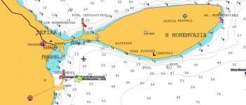 Note:Faisant route à L’est, elle raccourci de 20 milles la longue route menant de Porto Kayio à Maléa, permettant d’attendre au mieux un horaire de passage matinal du cap avant que les brises de l’après midi ne se renforcent