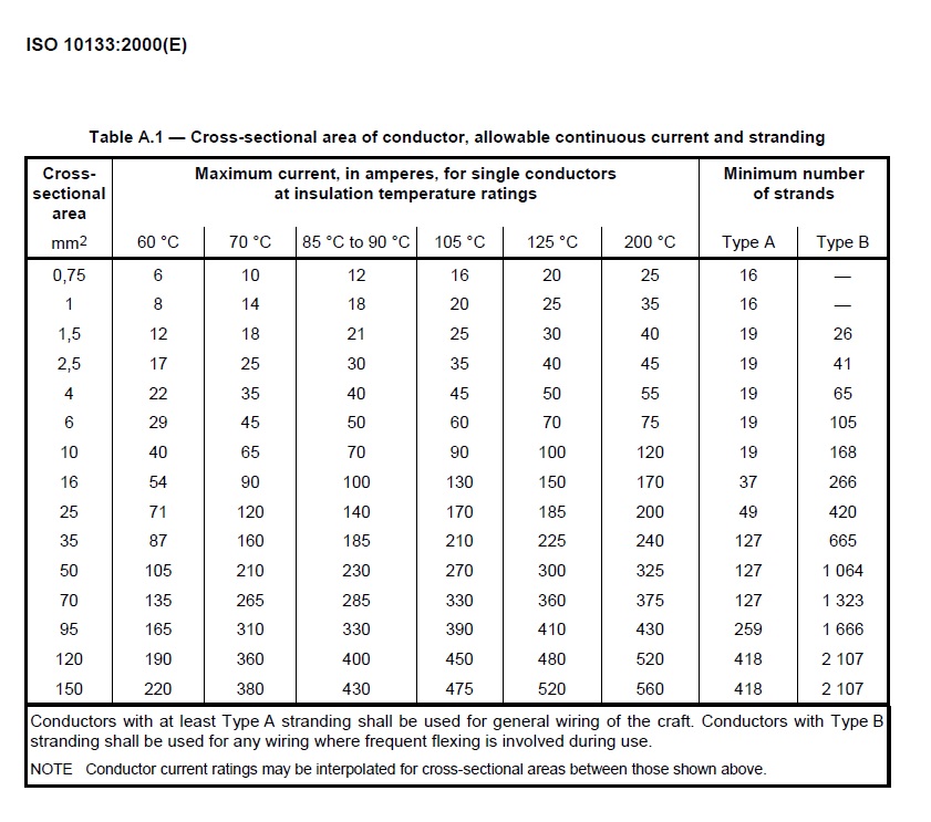 Les deux normes ISO 10133 et 13297 applicables aux bateaux de plaisance précisent que les fils sont obligatoirement multibrins et donnent même un nombre de brins minimal suivant l’emploi (statique ou flexion).