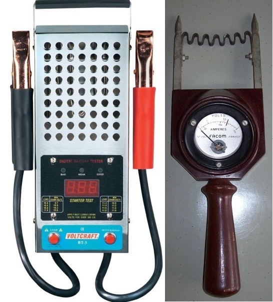 Le contrôleur de batterie utilisé couramment fait la mesure de tension en faisant débiter une intensité élevée (souvent 100 A en automobile) dans une résistance de puissance, avec le type de contrôleur illustré (high-tech à gauche, vintage à droite)...