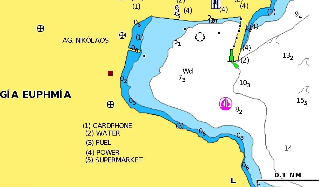 - L’axe des lignes de mouillage de la jetée croise à 90° celui des bateaux mouillés au début du quai nord, créant un risque certain de confusion. Les marins de la société gérant le port, vous indiqueront à la VHF comment mouiller.