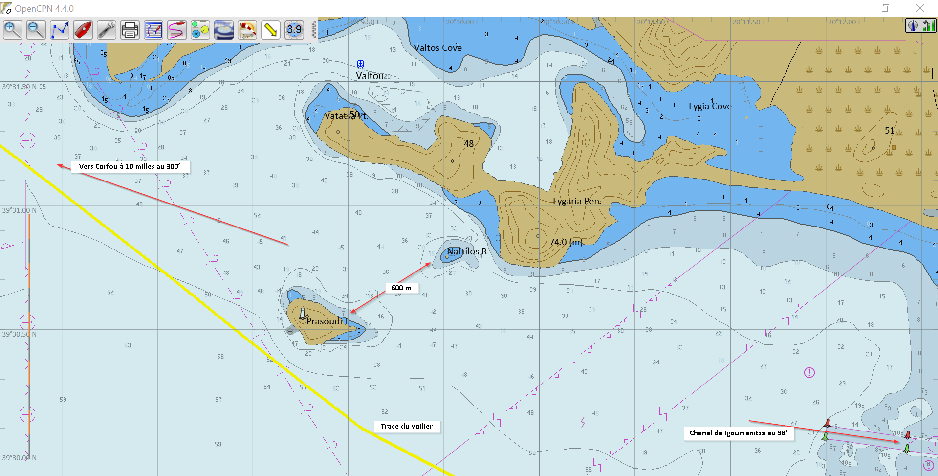 En faisant route sous voile au large d’Igoumenitsa, grand port commercial à quelques milles de Corfou. Il n’y a pas de rail, et les bateaux doivent emprunter un chenal étroit. Il passe ici plusieurs dizaines de ferries et de bacs tous les jours.