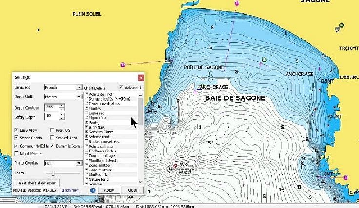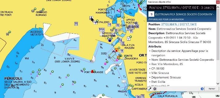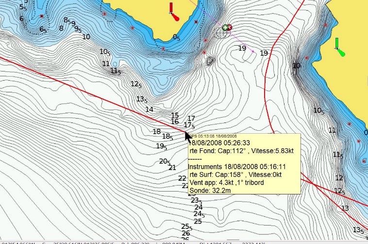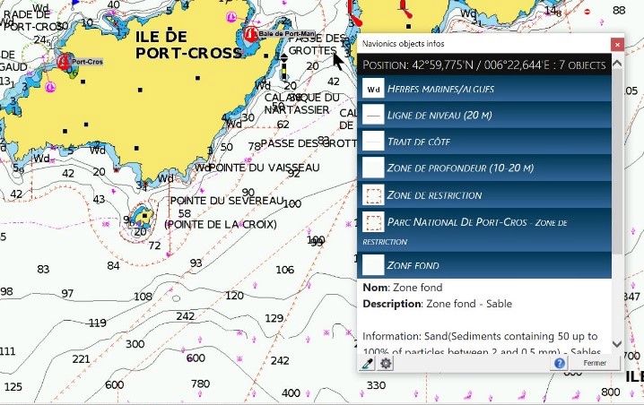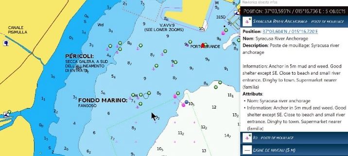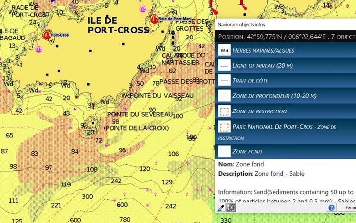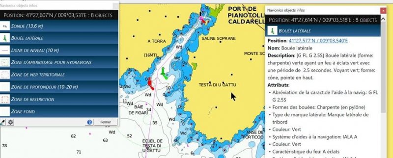 - Une meilleure présentation des informations liées aux objets de la carte (sonde, port, mouillage, bouées, etc.)