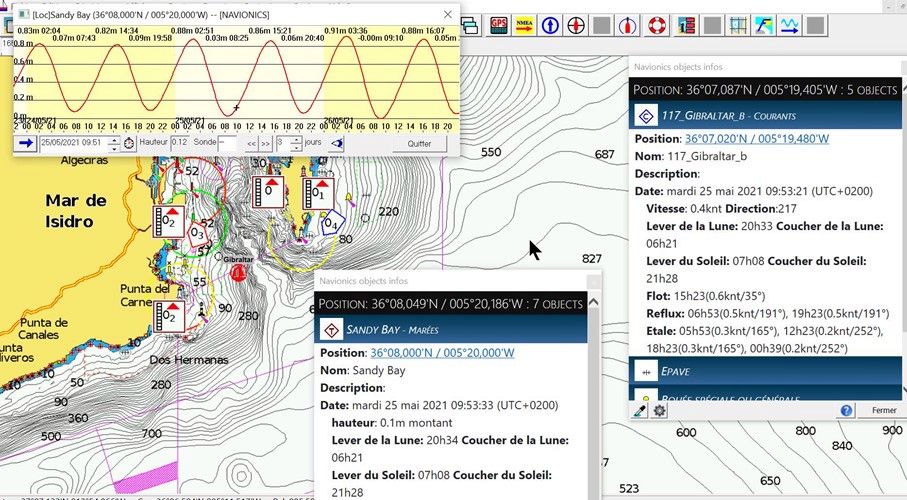 - On peut afficher les hauteurs d’eau et les courants de marée en ayant sélectionné « Objets Dynamiques ».